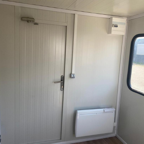 Este contenedor garita de 2,70 m x 2,20 m está diseñado para albergar a una o dos personas, lo que lo convierte en un espacio ideal para filtrar a los visitantes, el personal o los clientes. Combina seguridad y comodidad, garantizando un entorno funcional para una vigilancia o una recepción eficaces.